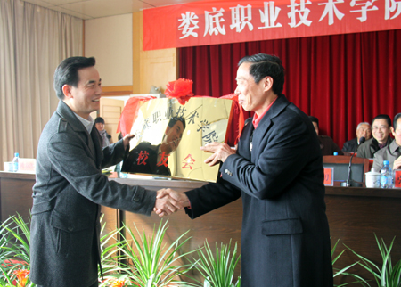 在热烈的掌声中,娄底职业技术学院第一任党委书记胡卫平将“娄底职业技术学院校友会”金色牌匾交到了杜祥培院长手中。随后,院团委书记杨惠梅、校友代表娄底市政府副秘书长罗光才致贺词。会议上还宣读了湖南省教育厅、省教育厅职成处、娄底市副市长鄢福初、我院第一任院长刘演林发来的贺信。