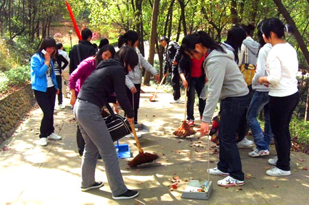 活动当天,全班分成两组,一组专门负责道路上的垃圾,一组专门负责草丛里的白色垃圾。各组成员团结协作热情主动,不怕脏不怕累,他们灿烂的笑容、亲切的话语、诚恳的态度,展示出我系学生朝气蓬勃和乐于奉献的良好精神风貌,为行人留下了深刻印象。(09造大一班)