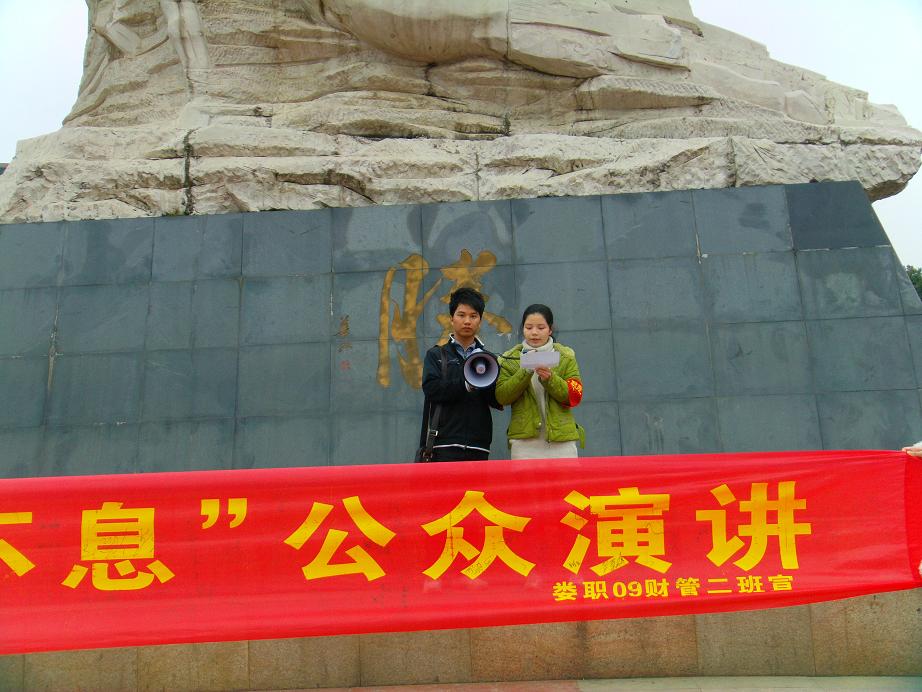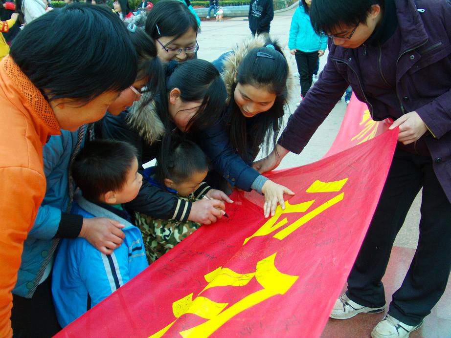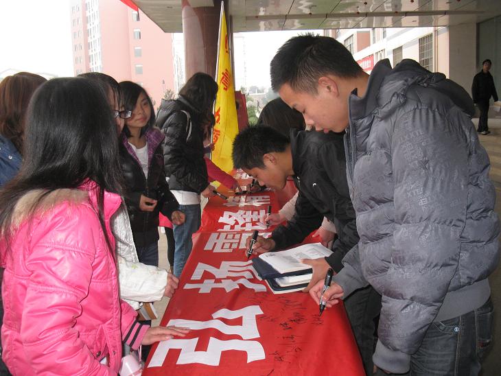 3月15日我院财经贸易系09会大一班在主教楼门口、石马公园、火车站举行了“弘扬雷锋精神,营造三月真情”万人签名活动。