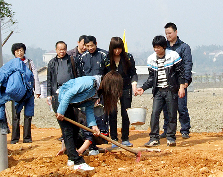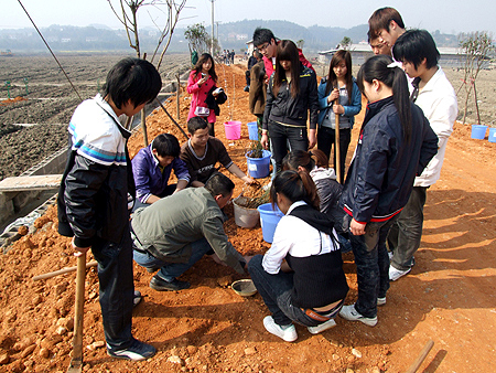 3月27-28日,在中阳村的开心农场菜蔬基地,人头攒动,热闹非凡,这是农林系绿色行动队的师生在进行“科技送下乡”的便民活动,由院领导周意坚、曾国基亲自带队,农林系主任刘梅秋、学工主任易瑜、团总支书记王琦、园林技术教研室主任曾玉华带领园林技术、畜牧兽医专业25名青年志愿者来到了中阳村的田间地头,师生们把从农林系实训基地里培育出来的400株珍贵台湾果桑苗与200株太空橘柚赠送给中阳村,并亲手把它们栽到了地里。学生们有的在田间栽培幼苗、有的在养鸡场里做养殖实践、有的为蔬菜大棚覆膜、清理水沟,大家干得热火朝天,也吸引了来这里调研的张硕辅市长的注意。张硕辅来到学生们中间,热情地与大家交谈,学生们围站在市长周围,你一句我一句地向他汇报着情况,张硕辅仔细听着,不时点头,当他听说中阳村将划出十多亩地做为农林系的校外实训基地,同时学生们以后还将定期到中阳村,为今天种下的植株修剪、整形、防治病虫、加工果实等时,张硕辅高兴极了,他说,“同学们,这就是真正地把课堂设在了田野里,你们的工作很有意义,娄底职院的院村合作做得很到位”。他还风趣地说:“以后农户张硕辅在中阳村开心农场的自留地就交给大家来打理,希望在今年秋天就可以吃到大家的劳动果实。” 引起了在场所有人的开心大笑。