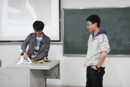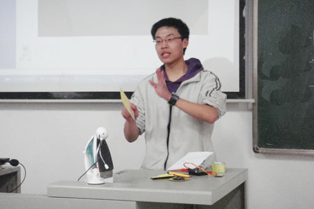 电气协会会长赵睿现场讲解了制作单片机发声器的原理,并介绍单片机热转印制作法。在制作过程中,同学们都对单片机的“神奇功能”萌发了好奇心,并在互动环节中,提出了自己的不解之处,赵睿对其进行了一一的分析讲解。有的同学还勇敢的走上讲台,亲身体验制作的乐趣。