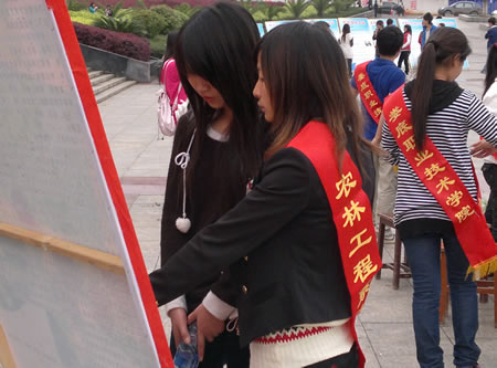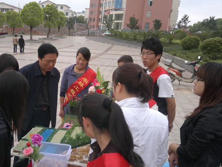 早7点我系的接待员将展览区布置在主教楼大楼前,背着欢迎绶带的接待员成为了校园里一道美丽的风景线,宣传展览台的新颖更是吸引眼球的一大亮点。展览区里家兔、小仓鼠、乌龟、金鱼、鸽子等畜牧专业同学在实验室饲养的小动物;园林专业的校外实训照片、园林工程模型、插花作品等引来了单招考生和在读同学的广大关注,更吸引了附近的居民、小朋友,来观赏的人络绎不绝。接待员针对大家感兴趣的问题,为大家作的详尽解说。