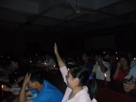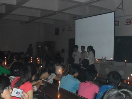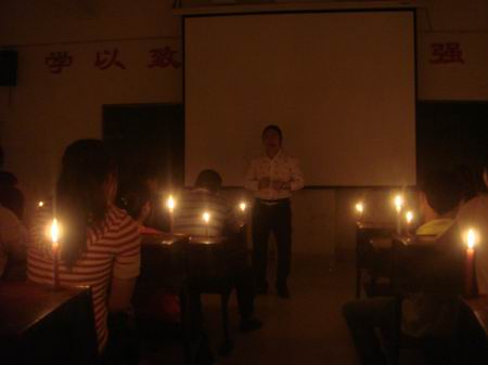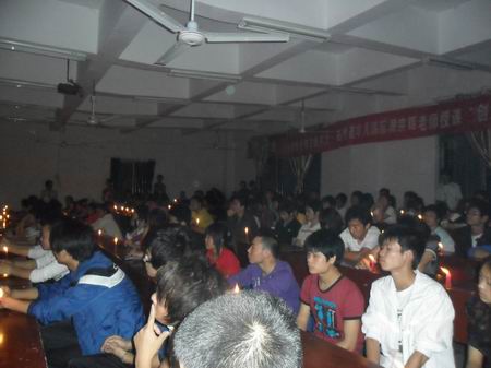 由于学院停电,课桌上整齐地点放着蜡烛,周宗辉先生的演讲正如这明亮的烛光,点亮了莘莘学子就业、创业、追求幸福人生的理想之路。(谭慧)