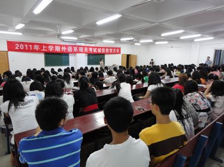 6月15日晚上7点,外语系在主教学楼310举行期末诚信教育考前动员大会,参加大会的有学工主任贺建良、团总支书记陈秀丽、辅导员周春红、杨益及09、10级全体学生。大会由教学主任肖付良主持。