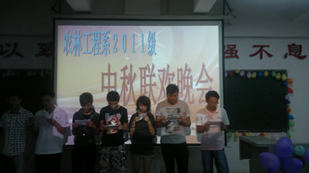 “海上生明月,天涯共此时”。在这阖家团圆,喜迎佳节之际,由我系2011级新生主办的2011年中秋联欢晚会在主教楼410室热烈举行。学工主任易瑜,辅导员朱静姝,助理辅导员,军训教官,系学生会主席团、各部门部长参加晚会,与2011级全体新生共度中秋。