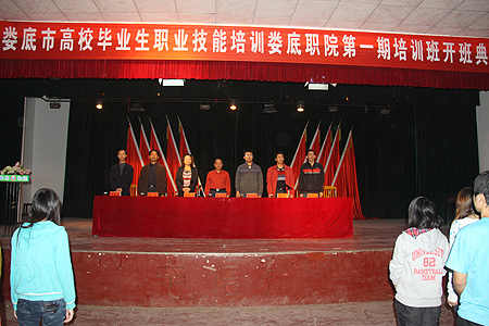 9月22日下午,2011年娄底市高校毕业生职业技能培训娄底职院第一期培训班在南苑礼堂举行了开学典礼。副院长周意坚、娄底市人力资源与社会保障局就业分局副局长邵淑红、职业能力建设科科长戴邵新、我院继续教育部主任刘罗仁、副主任李臻、邓喜培等出席了本次典礼,典礼由刘罗仁主持。