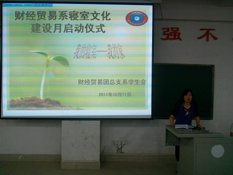 10月11日晚,财经贸易系在主教楼110教室隆重举行了“寝室文化建设月启动仪式”。院学工处副处长江国元,系学工主任刘媛、全体辅导员及学生代表200余人参加了本次启动仪式。