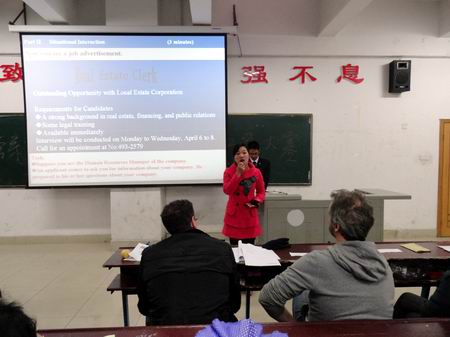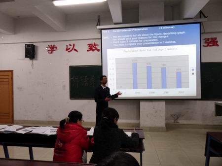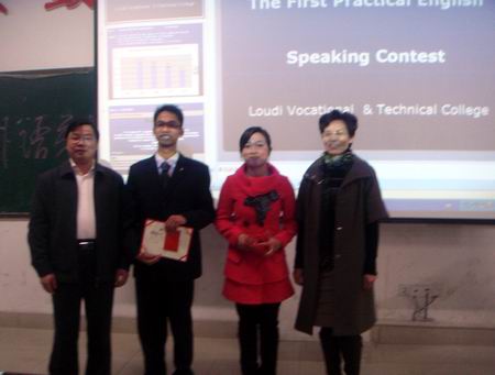 为营造全院学习英语口语的良好氛围,展现和提高我院学生英语口语表达水平,并藉此选拔优秀人才参加湖南省第八届高职高专实用英语口语大赛,11月30日晚7:00 ,我院首届实用英语口语大赛暨湖南省高职高专实用英语口语大赛选拔赛在主教学楼110举行。本次比赛由教务处主办、外语系承办,担任大赛评委的有教务处处长胡拥军、外语系主任刘燕、财贸系教学主任朱阳生、公管系教学主任李海莉、外语系学工主任贺建良、教学主任肖付良及周萍、夏美莲老师、外籍教师Robin 和Ramon。