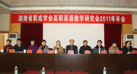 12月3日,湖南省职成学会高职英语教学研究会2011年年会在我院主教楼多功能报告厅召开。出席年会的领导及嘉宾有:我院党委书记陈立楚,纪委书记邹松建,湖南大众传媒职业技术学院副院长方建超,中国职教学会教学工作委员会、高职英语教学研究会秘书长闵阅女士,教育部高职高专英语类专业教学指导委员会委员、长沙民政学院外语学院院长贺雪娟教授,英语教学研究会副主任、湖南大众传媒职业技术学院国际传播系主任徐笛佳,湖南交通职业技术学院公共课部副主任刘圣明,长沙民政职业技术学院外语学院副院长郭定芹,湖南科技职业技术学院应用外语系主任李奕,娄底职业技术学院外语系主任刘燕。来自全省各高职院校的英语负责人及骨干老师65人参会,我院外语系全体老师参加。