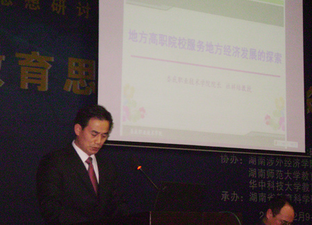 杜院长认为,地方高职院校是地方政府举办的高等职业院校,具备高等性、职业性和地方性的特点。因此,服务地方经济发展是地方高职院校的神圣使命,是地方高职院校存在价值之所在,是地方高职院校发展动力之所在,是地方高职院校办学质量标志之所在。地方高职院校要实现服务地方经济发展的目标,必须坚持以准确的办学定位为基础,以专业与产业的对接为关键,以产学研一体化为途径,以人才培养为根本落脚点。同时,他以娄底职业技术学院服务地方经济发展的尝试为例阐明了地方高职院校的治校方略,得到了与会代表的高度评价。