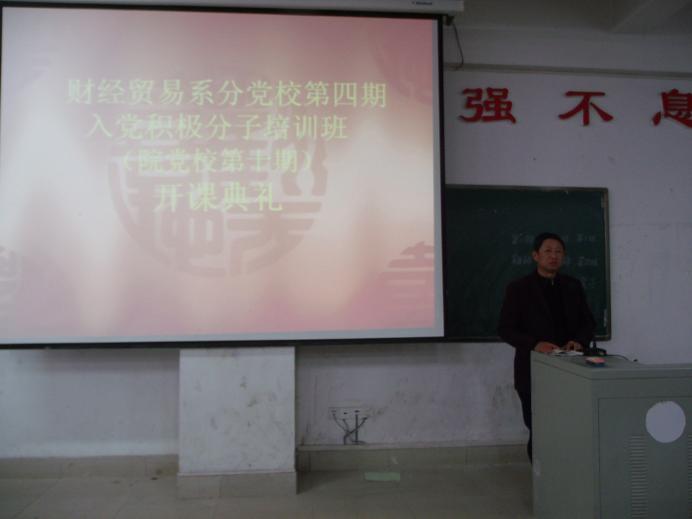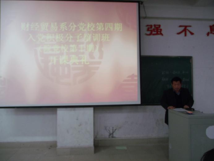 12 月 9 日 晚 ,财贸系分党校在主教学楼 110 教室组织召开该系第四期党校开课典礼暨第一次培训课。院党委副书记、党委校长欧友佳,院党校副校长刘高永、封权初,财贸系党总支书记、分党校校长蒋美群莅临开班典礼,资源工程系主任胡治民、副主任曾素纯和我系学生党支部书记刘媛等及 259 名财贸系入党积极分子参加本次典礼。典礼由财贸系主任朱岳坤主持。