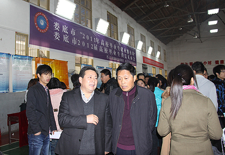 12月18日,我院2011年毕业生供需见面会在室内球场隆重举行。来自北京、上海、广东、浙江等十几个省市以及湖南本地的120余家企事业单位前来现场纳贤,我院2012届毕业生2000多人参加了招聘会。此次招聘会由我院与娄底市人力资源和社会保障局联合举办,副市长鄢福初、人力资源和社会保障局局长郭国林、副局长肖卫龙、教育局局长封旺洲、副局长张怡南及相关单位领导亲临现场指导。院党委书记陈立楚、副院长刘自斌、袁其谦及招生就业处处长朱存斋、副处长王少英等陪同视察并作汇报。鄢福初充分肯定了我院毕业生供需见面会的筹备工作,认为我院的招生就业工作措施得力,体现了国家骨干高职院校的风范。