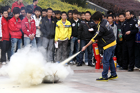 学生学习使用灭火器