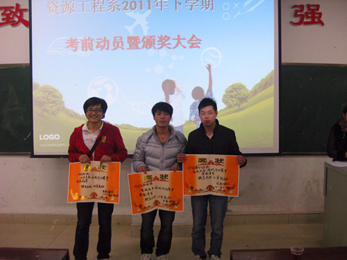 考前动员大会结束后,紧接着进行了颁奖大会,系主任对今年资源工程系在国家、学院与系里各个项目中获奖的集体和个人一一进行颁奖。一张张荣誉证书是对他们所付出汗水和心血的最好见证,希望得奖的同学能再接再厉,继续努力。