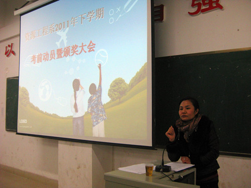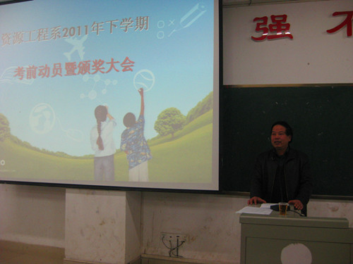 12月27日晚,资源工程系在主教学楼召开2011年下学期考前动员暨颁奖大会,全系同学都参加了大会。与会领导有系主任胡治民教授和系学工主任曾素纯副教授,大会由曾素纯主持。