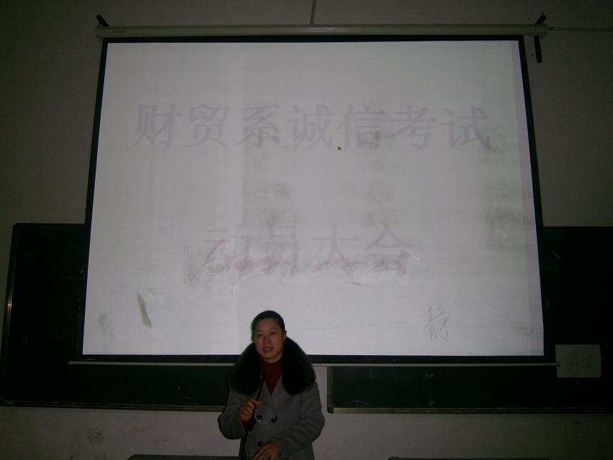 系部教学主任朱阳生和学工主任刘媛于2011年12月28日晚7:30在主教学楼教室为11级各班学生代表进行了诚信考试动员,朱阳生就考场规则及考前准备工作作了讲话,刘媛对考试中的注意事项进行了详细讲解。(财贸系)