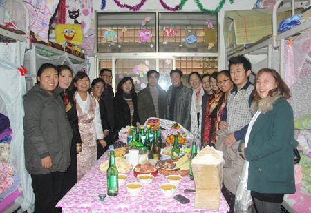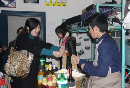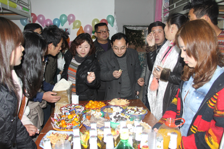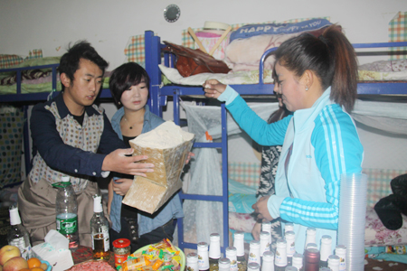 领导和老师们进门后首先进行了撒齐玛的节日仪式,随后品尝了“青稞酒”、“风干牛肉”、“卡塞”等一大批西藏特产,其乐融融。刘自斌语重心长的询问了大家的学习、生活情况,对藏族同学们的热情接待和平日里的优秀表现表示高度的赞扬,在场的领导老师们跟同学们拉起了家常,欢笑连连,并发放红包以表祝福。