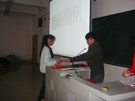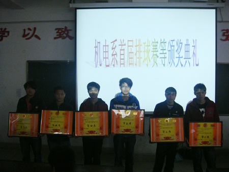 3月30 日中午,机电系在主教楼110教室举行排球比赛颁奖典礼,机电系学工副主任申再林为获奖代表队颁发了奖状及奖金,辅导员黄秧春、刘冬喜、贺莹晶、徐艺、王会及各代表队运动员参加了仪式。