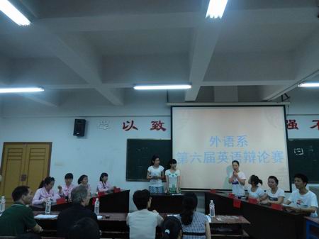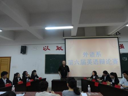 为培养同学们对英语的兴趣,提升英语口语能力。5月9日晚,外语系在主教学楼510举行了第六届英语辩论赛。比赛由胡月及孙田田主持。此次比赛的评委有:系主任刘燕、教学主任肖付良、学工主任贺建良、教学干事龚文锋、辅导员杨益、周春红以及外语系全体同学。