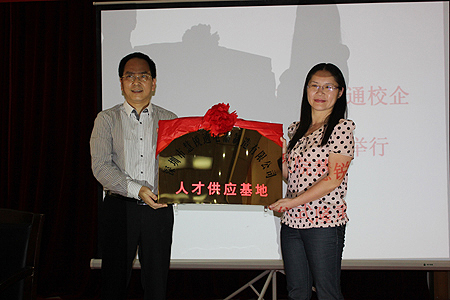 在热烈的掌声中,肖铭向电信系系主任游新娥授予了深圳市慧锐通电器制造有限公司人才供应基地的牌匾。