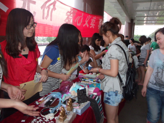 本次活动义卖的物品都是由学生捐献出来的学习用品及其饰品书刊等,虽然东西都不是很贵重,但代表了大家的一份心意。晚7点整,义卖活动正式开始,学生会各组成员都耐心地面对着前来选购的同学们,响亮地喊着义卖的口号“伸出你的手,献出你的爱,铸就爱的长城”。数以百计的同学被爱心义卖所吸引,他们怀着一颗善良、真诚的心选购自己喜欢的物品,为“爱心义卖”活动尽自己的力量,为需要帮助的人献出了自己的爱心。不少路过的老师也对此表示支持并买了一些小饰品。
