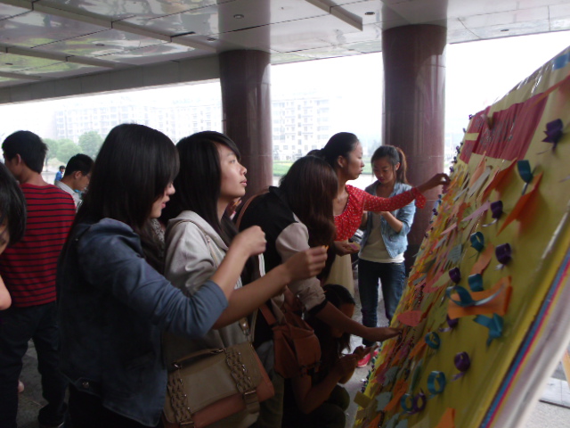 本次活动主要让各班同学们写下自己的心愿或者理想,粘贴在位于主教楼前心教部精心准备的“许愿墙”上。同学们都积极参与,纷纷写下自己的愿望:“家人、朋友身体健康”、“友谊天长地久”、“通过会计考试”、“能力得到充分锻炼”等等。 每一张卡片上都写着同学们对大学学习生活的规划及其美好祝愿。心愿墙上的小卡片颜色五彩缤纷,煞是好看,载满了同学们美好的愿望。