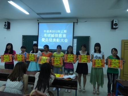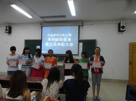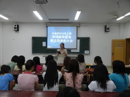 6月17日晚7:00,外语系在主教学楼602举行2012年上学期诚信考试教育暨学生工作总结表彰大会。参加大会的有教学主任肖付良、学工主任贺建良、辅导员杨益、周春红及外语系全体学生。