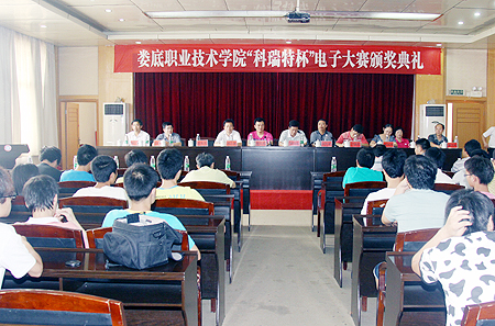6月20日,第四届“科瑞特杯”电子技能竞赛颁奖典礼在主教学楼报告厅举行。副院长刘自斌、袁其谦、湖南科瑞特电子股份有限公司董事长张玉希、公司领导刘长林、赵永飞、陈玉婷,我院校企合作办主任王威然、电信系主任游新娥、党总支书记吴莲贵、副主任谢完成、刘益洪、李规出席仪式并为获奖者颁奖。电信系电子实验室、应用电子技术专业、通信技术专业全体教师及学生、其他专业获奖学生参加了典礼。典礼由刘自斌主持。