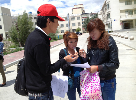 7月22日、23日,志愿者们在西藏职业技术学院针对青年大学生进行了问卷调查和个别谈话,通过调查和谈话了解时代青年对本民族文化以及中华文化的熟悉情况。活动中,西藏青年学生热情配合,主动介绍西藏的人文风情,双方交谈愉快。
