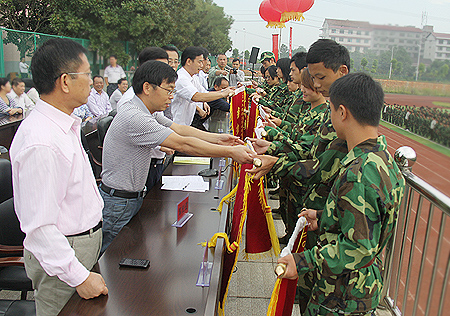 刘自斌宣读军训优秀班级名单。与会院领导为12级汽车电子技术班、会计大一班等获奖班级颁发了奖旗。