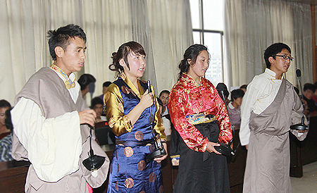 西藏学生们在会上做了精彩的民族歌舞表演。无论是大家耳熟能详的《康定溜溜》歌,还是载歌载舞的《吉祥谣》、《铜嘎》,身穿藏族服装的藏族同学们翩翩起舞,令现场呈现民族团结大融合的浓郁氛围。(欧阳琦)