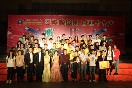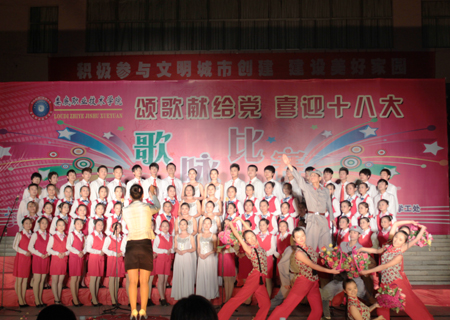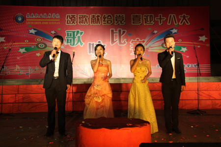 9月28日晚,我院院团委、学工处主办的“颂歌献给党,喜迎十八大”歌咏比赛在学院文化广场隆重举行。院领导杜祥培、欧友佳、龙伟、周意坚、刘自斌、袁其谦出席,学工处、团委负责人、各系部学工主任和大一新生辅导员观看了比赛。比赛邀请了阳帆、杨翰儒、祖宾、李敏芝、李荔等老师担任大赛评委。