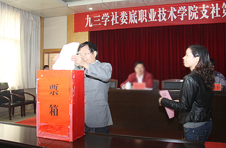 会议第二阶段为换届选举大会。由九三学社娄底市委专职副主委梁卫平主持。曾毅刚首先宣读九三学社娄底市委对九三学社娄底职院支社的换届批复。全体会员以举手表决方式通过选举办法,监票人、计票人名单。工作人员宣读支委候选人简历介绍后,与会社员以无记名投票方式选举支社委员会委员。九三学社娄底职院支社有社员29人,实到27人,收回选票27张,有效选票27张。