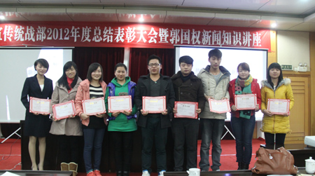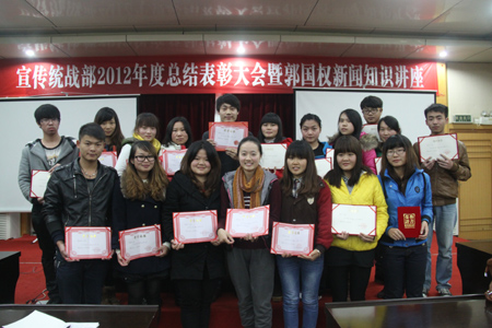 在总结表彰环节,主持人李珍、田皓尹宣布了院报和广播站的新任领导班子、新成员名单,宣读了在2012年度表现突出的优秀个人名单。宣传统战部部长及老师为获奖同学颁奖并合影。