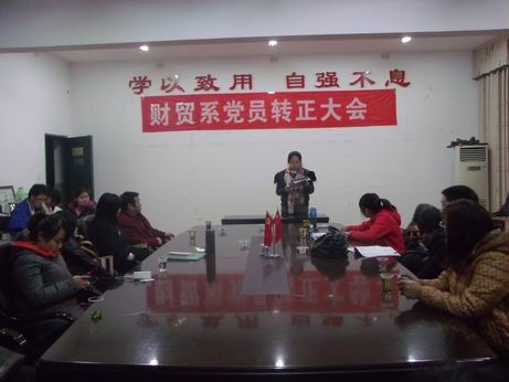 12月6日晚,财贸系学生党支部预备党员转正大会在实训楼207室举行。财贸系党总支书记蒋美群,学生党支部书记刘媛,学生党支部宣传委员成柳才,学生党支部组织委员张雯宇、全体辅导员及全体预备党员参加。大会由张雯宇主持。