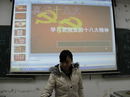 会上,各班就十八大的具体内容进行了详细讲解,对十八大精神展开了深入探讨,并对如何贯彻十八大精神作了具体剖析。在观看有关十八大的视频以及材料后,同学们积极展开讨论,踊跃发表自己的看法,抒发内心的真情实感,表达自己对十八大精神的理解。大家都表示,十八大的精神应该延续下去,并渗透到学习和生活的各个方面,作为大学生应该认真学习,从现在做起,从身边小事做起,努力迎接学业和事业的双丰收。不少班级还通过游戏、签名、有奖竞答等生动活泼的形式让同学们更形象地了解十八大,表达对党的热爱。
