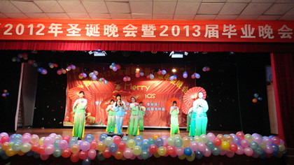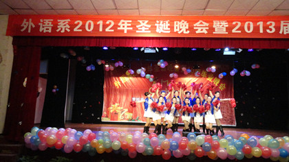 晚会由10订单班的舞蹈《欢天喜地》拉开序幕,欢乐的歌声与优雅的舞姿让会场立刻沸腾。运用中英文双语主持的六位金牌主持人闪亮登场,将晚会带入东西方文化结合的最高境界。10商英班的歌伴舞《青藏高原》,让现场的师生感受到风格清新的异域风情;11订单班的诗朗诵《我的南方和北方》带观众走到了祖国的天南地北;12商英班的小品《绝处逢生》幽默诙趣,赢得了阵阵喝彩声;11订单班的舞蹈《最炫民族风》、12商英班的《浪漫樱花》、10商英班的《风酥雨忆》、10订单班的《那些花儿》、10应教班的《英语律动》、11应教班的《诗歌舞蹈》、12应教班的歌伴舞《采莲曲》、外语系男生表演的《My love》、11商英班的独唱《我的心里只有你没有他》、学生会的现代舞《Pocker face》在这个温馨的夜晚给人以震撼的视觉冲击。另外外语系教师的舞蹈《欢乐中国年》、外教合唱的中文版《甜蜜蜜》表达了对全院师生新年的祝福,将晚会推向了新的高潮。纪委书记邹松建致辞并向两名外教赠送了节日的礼物,同时圣诞老人带着游戏和奖品登场,给幸运观众带来惊喜和礼物,为现场营造了浓郁的圣诞喜庆氛围。
