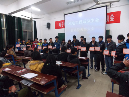 1月11日,机电系学生会总结暨表彰大会在主教学楼102召开,参加此次会议的有该系学工副主任申再林、全体学生会干部以及11、12级各班班长。会议由机电系学生会主席谌遐主持。