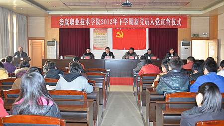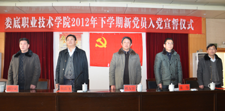 1月18日下午,我院2012年下学期新党员宣誓大会在主教学楼报告厅举行。党委副书记欧友佳、党委委员、副院长颜彩飞、龙伟、刘自斌、纪委书记邹松建出席会议,院组织部部长刘高永、党校副校长谢丽珍、各党总支书记、系党支部书记、系学生支部书记及全体新党员与会。会议由党委委员、副院长颜彩飞主持。