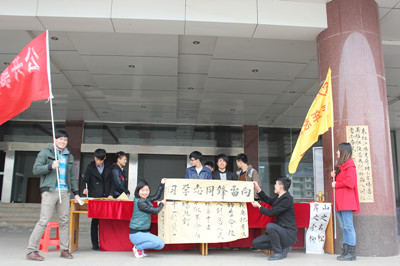 为宣传雷锋精神,增强学生学雷锋的意识,3月14日,公共事务管理系团总支组织志愿者在主教楼前举办了以“学雷锋精神,展公管风采”为主题学雷锋书法展作品赠送活动。