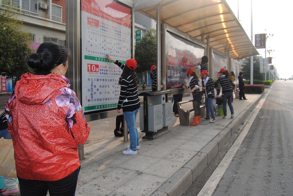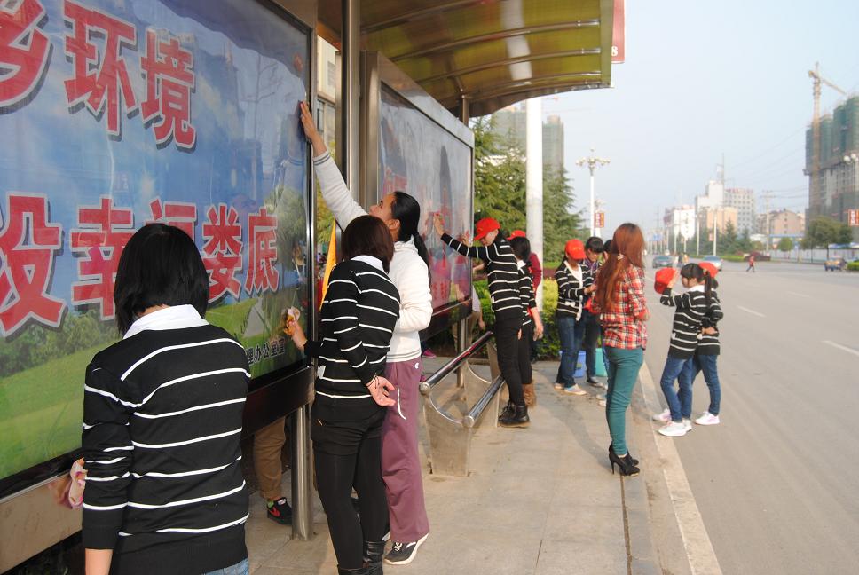 3月18日,财贸系志愿者服务队积极响应院团委的号召,并在财贸系团总支的部署安排下,对娄底职业技术学院公交车站台至火车站所有站台的宣传橱窗玻璃外罩上面的积尘和牛皮癣广告进行了认真细致的清除,活动中,志愿者们相互配合,齐心协力,经过一个下午的清洁,宣传橱窗上的广告贴纸就被清理得干干净净,解决了长期以来宣传橱窗朦胧看不清车次的问题,为广大市民做了一件实事,在三月暖暖的阳光下,锃亮的玻璃反射出的不只是美丽洁净的城市,还有志愿者们美丽的心灵。