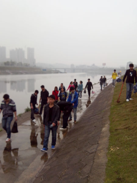 青年志愿者们“采访”了娄底市的母亲河――涟水河和孙水河,通过与附近居民们的交谈,大家对这两条河的历史有了相应的了解。随后机电系志愿者们开始了此次的学雷锋活动――用行动保护母亲河活动。