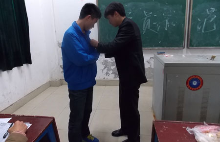预备党员贺飞、廖银炼先后讲述了在志愿者活动月中大家的付出、自身存在的问题及今后的纪律。随后,申主任为预备党员代表谌遐和重点培养对象代表梁湘荣佩戴标识徽章并发表讲话:他肯定了大家在学习、工作及生活等方面起到的模范带头作用。他强调,为了让“示范工程”永不褪色,“党员示范工程”建设势在必行,他介绍了活动总体思路、实施办法,提出了明确的要求:系学生党支部为学生党员、预备党员以及重点培养对象量身定做标识徽章,系部以寝室为单位将与会人员的信息贴到寝室门上。他希望大家佩戴好徽章并维护好标识贴,接受老师及同学们的监督,时时处处严格要求自己,发挥先锋模范带头作用,让更多的学生加入到该项工程中来。