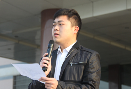 院学生会主席柳李斌代表院学生会发出倡议,倡议大家要爱惜粮食,适量定餐,避免剩餐,减少浪费,吃饭时吃多少盛多少,不留剩饭剩菜;要提醒身边的同学和朋友,积极制止浪费粮食的现象;要做节约宣传员,向家人、亲戚、朋友宣传节约粮食;要积极参加文明餐桌行动,营造节俭用餐的良好风气。(戴志鹏 杨勇)