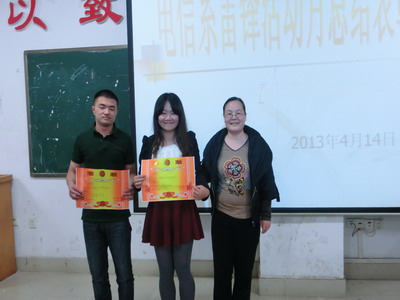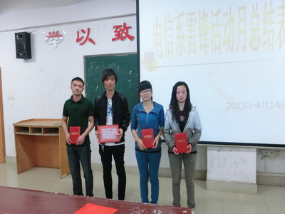 会议由李规主持,系团总支副书记张慧对各班在3月份学雷锋志愿者活动中的表现进行了简要的总结,随后李规宣布了系部“雷锋班级”、“学雷锋个人”名单以及“续写雷锋日记”征文比赛的获奖名单并进行了颁奖。其中12通讯班与12动漫班被评为“系雷锋班级”,11计应班阳义芳、11应电1班刘鑫、11软件2班詹雪琼、12通讯班刘霆、12动漫班胡凌飞五人被被为“系学雷锋个人”。 (电信系)