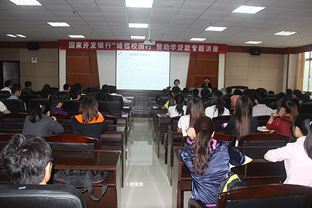 5月8日,国家开发银行湖南省分行业务经理廖安龙在综合楼一楼会议室作了一场关于高校助学贷款以及诚信知识的专题讲座。讲座由学工处副处长罗丽萍主持,各系部辅导员、11级部分学生、学生干部聆听了此次讲座。