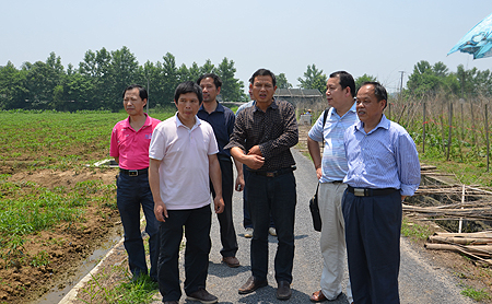随后,周意坚一行来到我院2012级农民创业培训班学员张良丰的蔬菜基地。张良丰是印塘乡岳家村人,承包了100多亩田,2011年大规模种植香芋,由于销售不利亏损5万元。2012年到我院学习后,立即进行市场调查与预测,开展多种经营,2013年种植了一季稻、葡萄、黄瓜、丝瓜、油菜、辣椒等粮油果蔬作物,预计今年收入近20万元。同时,他还联合周边农户成立了专业合作社,开展规模经营,带领乡亲们共同致富。周意坚一行下到张良丰的基地,仔细查看了他的稻田、大棚蔬菜和露天蔬菜。当看到张良丰的去年种植的葡萄没有剪枝整形挂果很少时,周意坚随即致电我院葡萄专家曾玉华老师,要曾老师在适当的时候去张良丰的葡萄基地进行技术指导,同时,告诉张良丰要与我院的专业教师多联系请教。