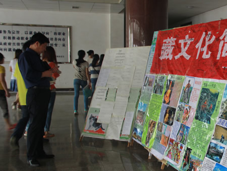 本次展出的展板包含藏族同学创作的藏文书法展示和西藏人民在服饰、饮食、居住、婚丧、节日等方面的风俗民情图文展示。把瑰丽的西藏民族文化展现在我院师生的面前。展览吸引了众多领导、老师和同学的眼球,纷纷停下脚步,驻足观赏。