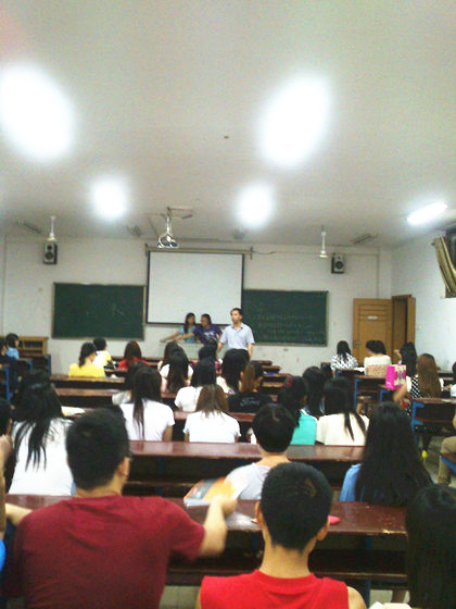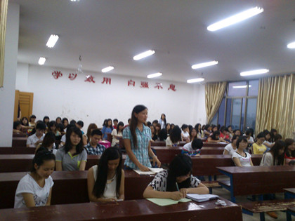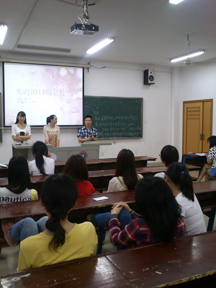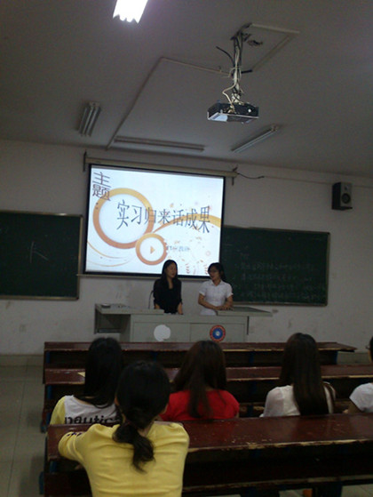 班会一开场同学们就积极上台发言分享成果,有的学会了如何鼓励、表扬学生,有的学会了游戏教学的技能,有的学会了怎样处理学生的突发事件,有的发现学生掌握的英语词汇量和语法超出了她的教学范围,意识到要加强专业知识的学习等等,班会气氛热烈,同学们沉浸在收获的喜悦中。