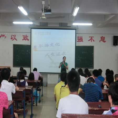 为了让同学们提前了解职场相关文化,电信系于6月12日晚上在主教学楼310面向于电信系11级全体学生举办了“职场文化,人生追求”讲座,学工主任李规、辅导员彭继光、李韶辉出席,娄底平安保险公司经理扶秋丽女士主讲。
